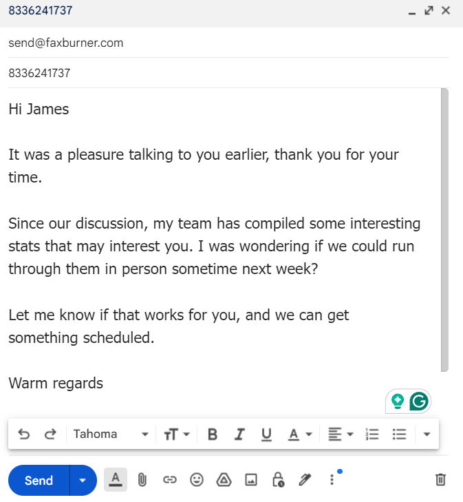 Now, you can type the body of your email if you wish. If you do, anything you type here will become the ‘cover letter’ of your fax. This is the benefit of using our online fax service to send a fax from Gmail (instead of a ‘normal’ fax machine), as you don’t have to spend time deciding upon a fax cover sheet template.